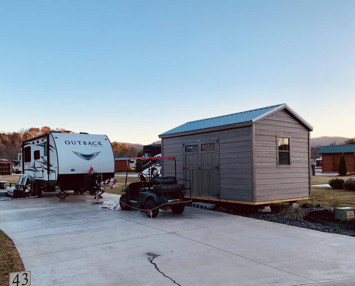 - Our storage buildings are delivered to your location fully assembled and put into place with a truck and dump trailer, similar to what is shown in the picture.